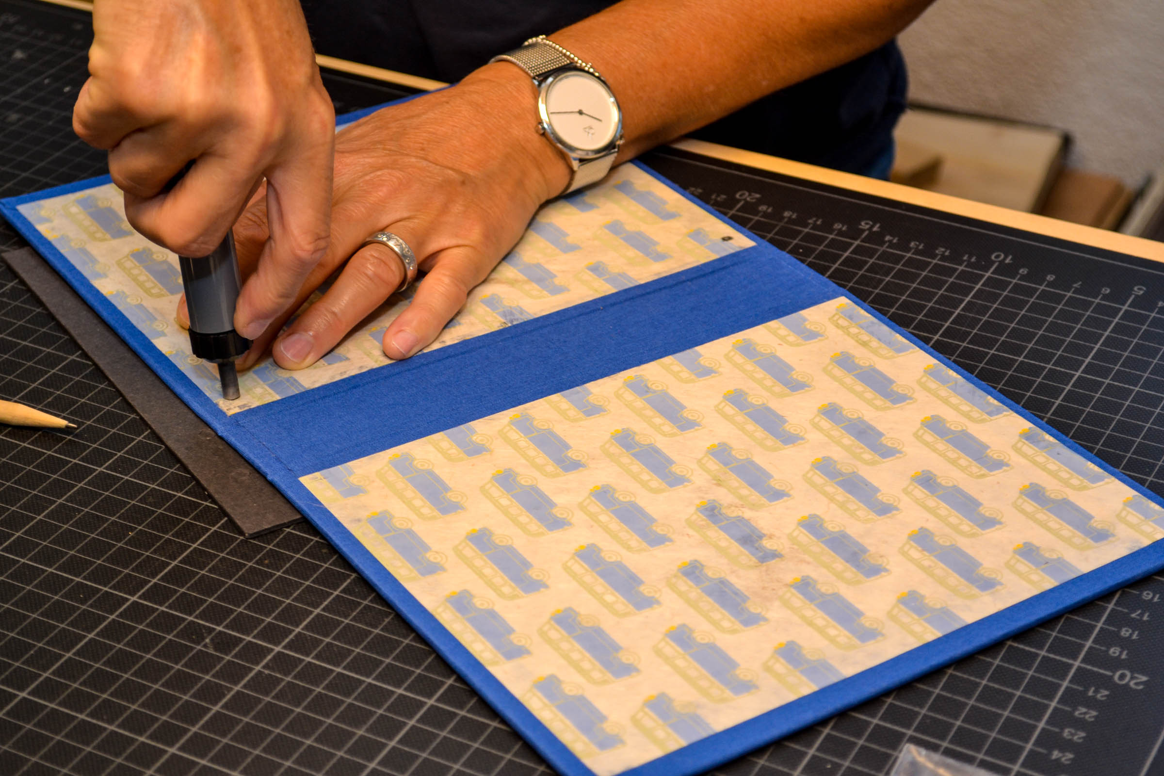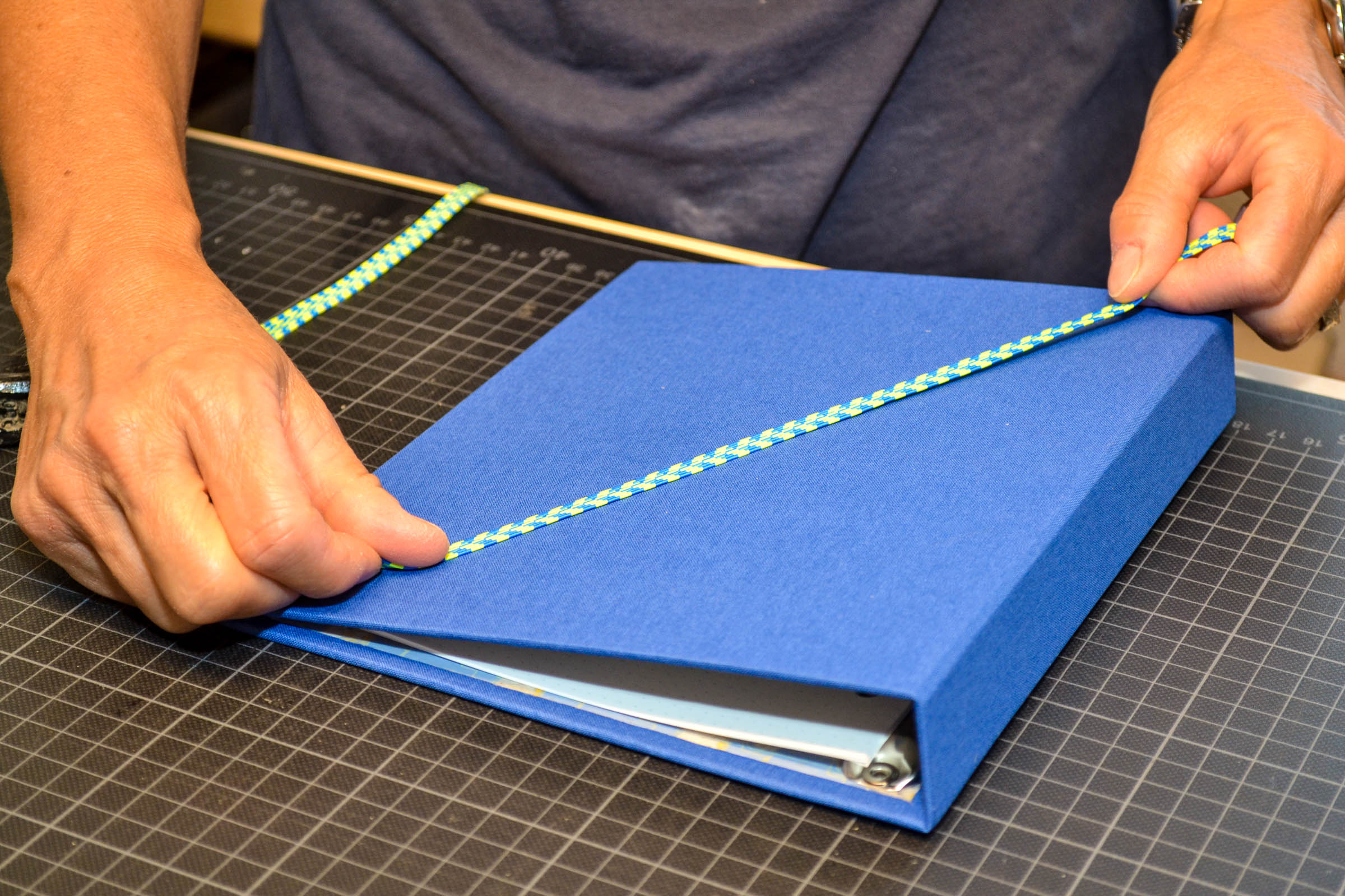 Ein neues Buch binden braucht Zeit, Ruhe und Geduld. Welche Papiere passen farblich gut zusammen, welchen Karton nehme ich, wo kann ich effektvoll ein spezielles Papier hinzufügen, wie verläuft das Gummiband um das Buch zusammen zu halten usw.